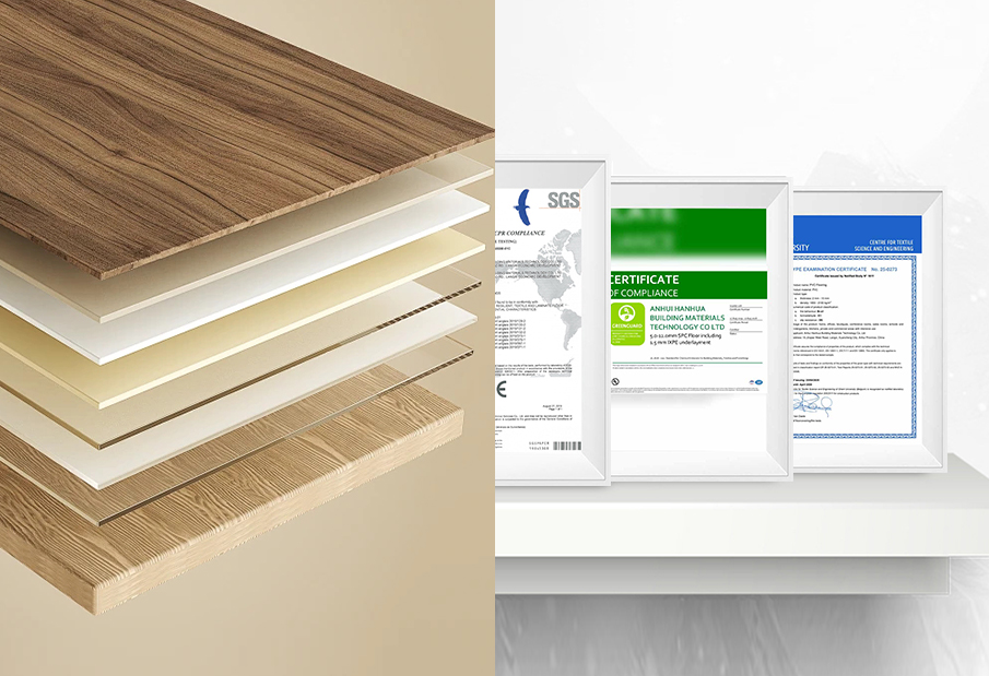The flooring offers several key features, starting with 100% waterproofing. It remains unaffected even after being submerged in water for 72 hours, making it ideal for use in damp areas like kitchens and bathrooms. The surface is coated with a UV layer, providing a hardness of 4H and a wear resistance of over 6000 rotations, with a lifespan of up to 20 years. The IXPE underlay reduces footstep noise by 15dB, providing superior comfort compared to ceramic tiles. The flooring is also certified by FloorScore and Greenguard Gold, ensuring it is free of formaldehyde and safe for babies and children.